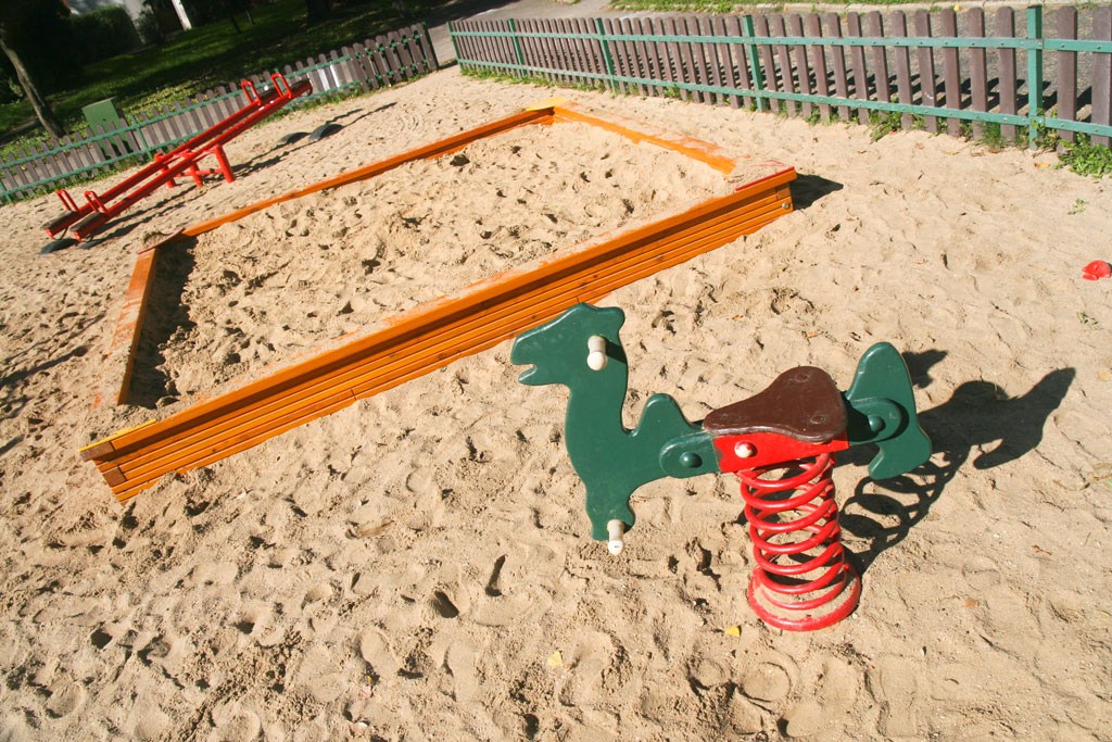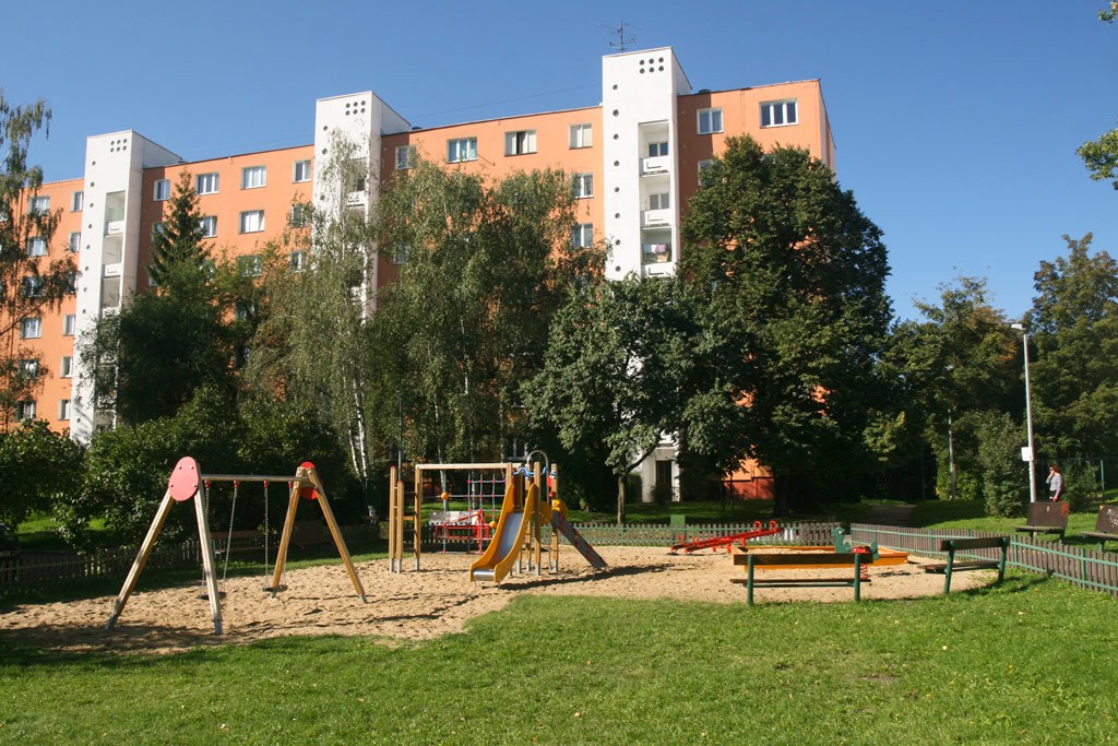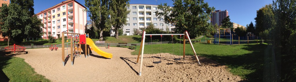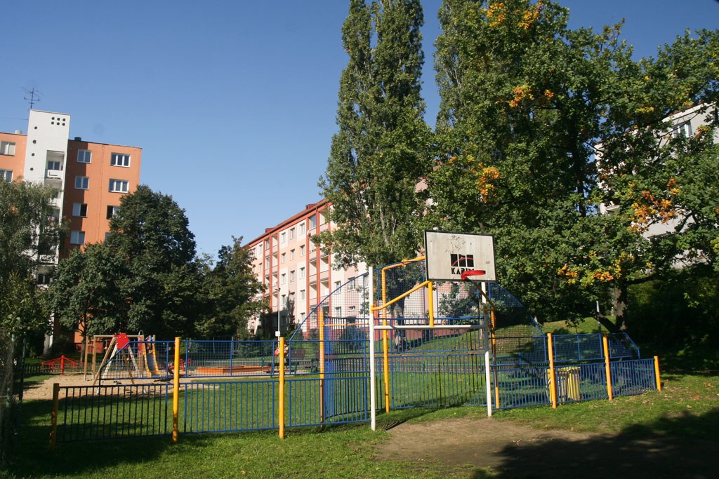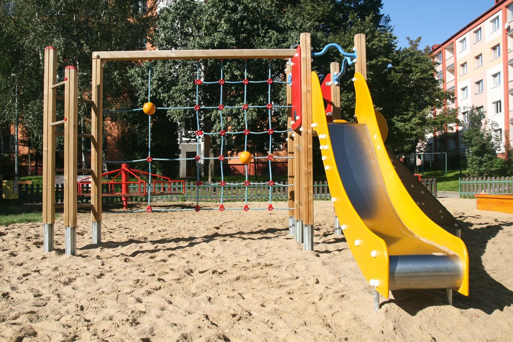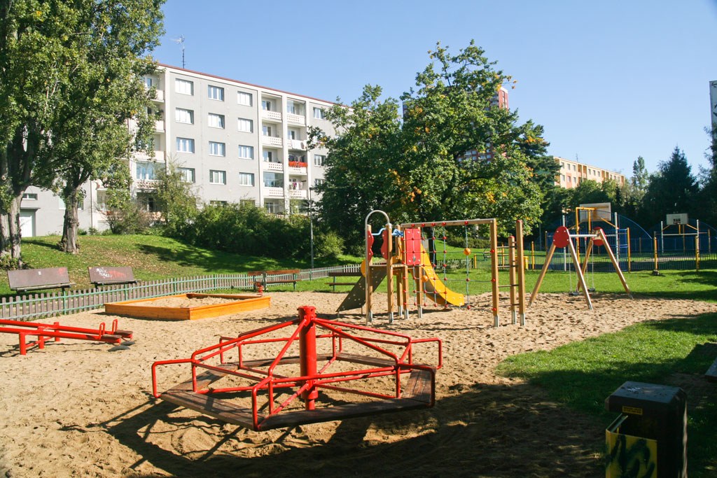 Vybavenost: sestava se skluzavkou a houpačkou, 2 x váhadlová houpačka, pískoviště, kolotoč, pružinové houpadlo pro čtyři děti, pružinové houpadlo, sportovní plocha s brankami a basketbalovými koši