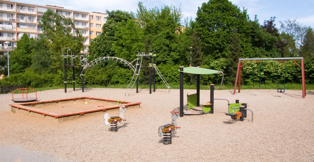 Vybavenost: víceúčelová herní sestava pro děti 5 – 12 let, sestava pro děti 2 – 5 let, kolotoč, 2 x pružinové houpadlo, houpačka (vč. opěradla pro batolata), pískoviště, stůl na stolní tenis