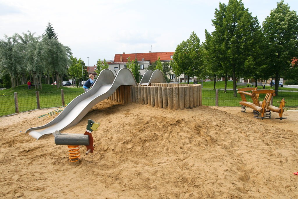 Vybavenost: písečná duna se dvěma skluzavkami, lanovým žebříkem, rampou, 3 x pryžové houpadlo, samostatně umístěna llanová pyramida s trampolínou