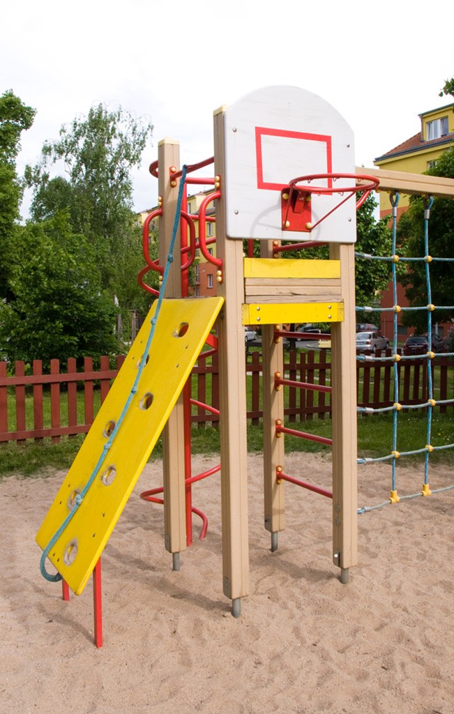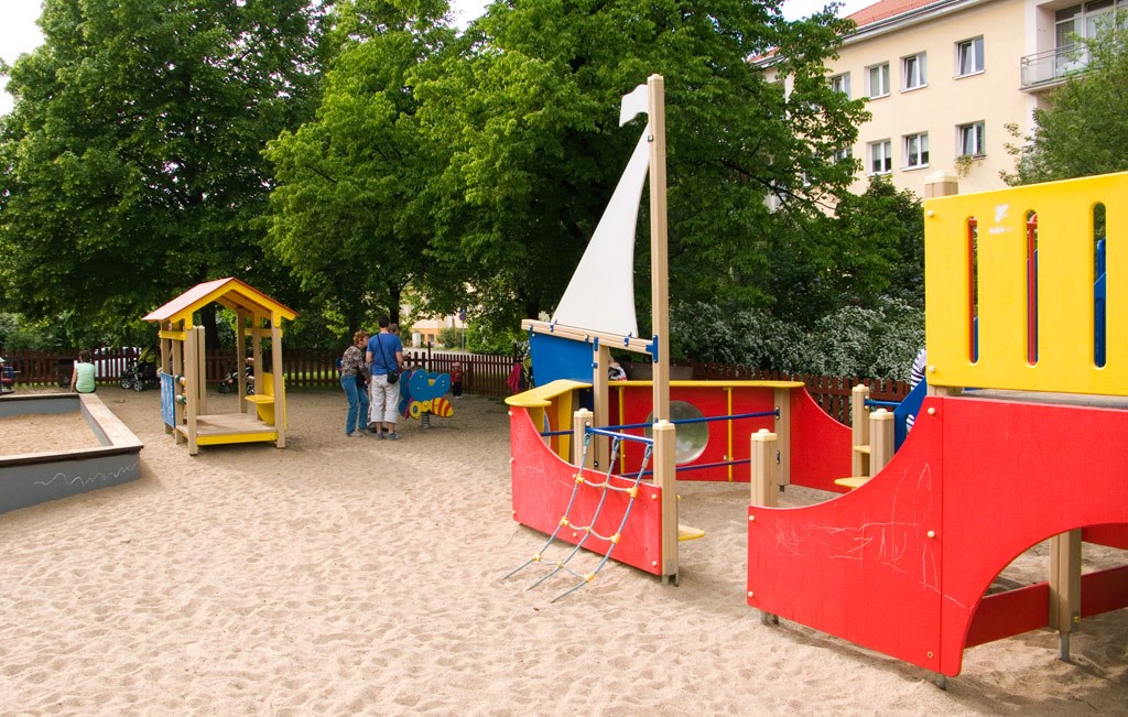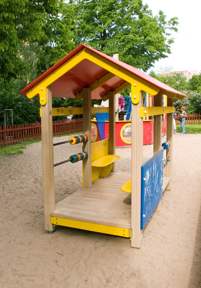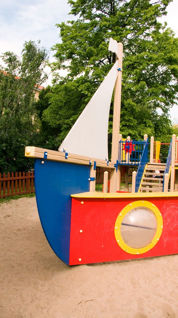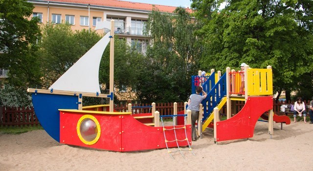 Vybavenost: 2 x věž se skluzavkami v centrální pískové ploše, samostatně "mini" pískoviště, 3 x pérové houpadlo, závěsné houpačky, váhadlová houpačka, lanová pyramida, multifunkční herní sestava - loď, sportovní sestava s košem, domeček s počítadly, tabule na kreslení, terč