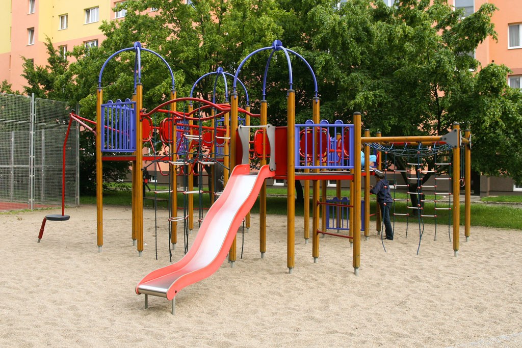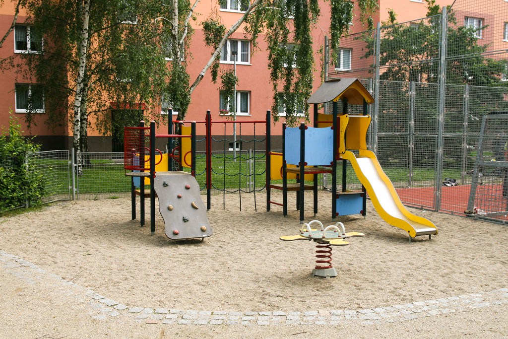 Vybavenost: sportovní sestava pro věkovou kategorii 5 – 12 let, houpačka, herní sestava pro děti 2 – 5 let, pružinové houpadlo jednomístné a čtyřmístné, pískoviště, sportovní plocha s umělým povrchem pro míčové hry.