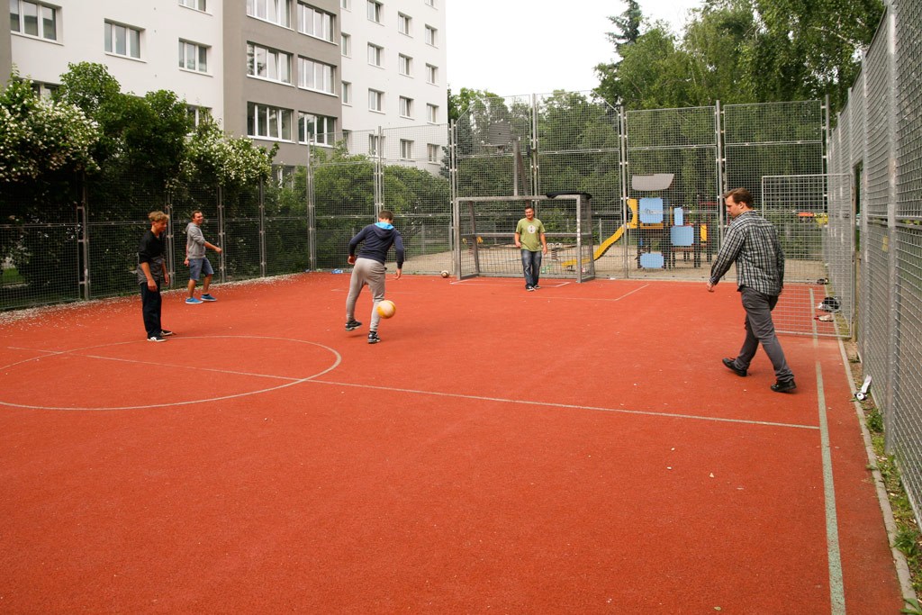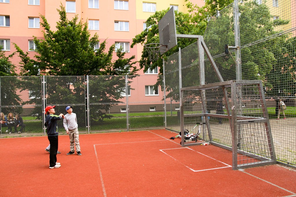 Specifikace: oplocená sportovní plocha, na kterou z jedné strany navazuje oplocené hřiště pro malé děti a z druhé strany neoplocené hřiště pro větší děti s multifunkční sestavou.