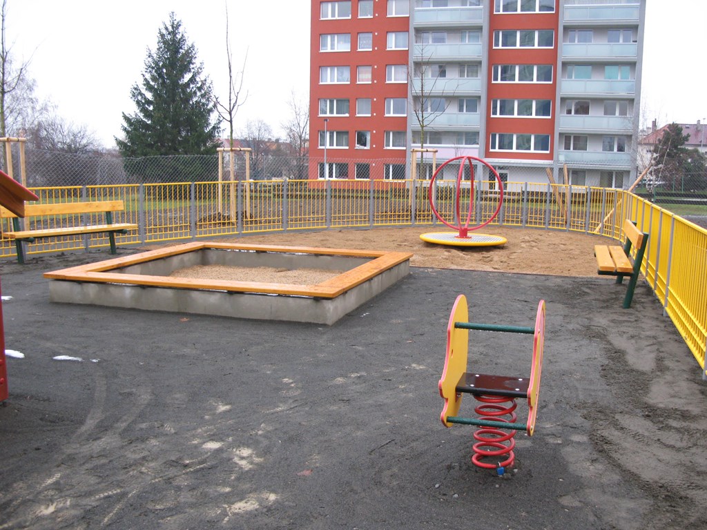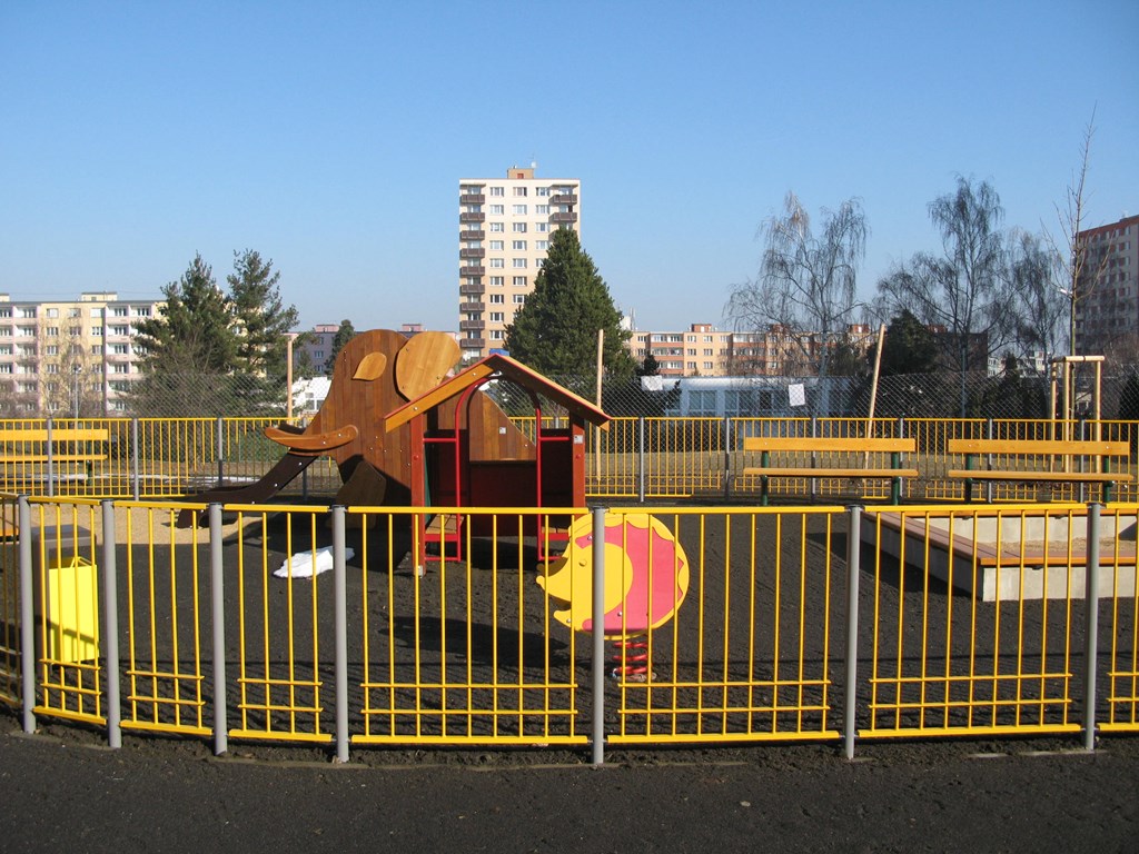 vybavení: sestava se skluzavkou, sestava šestihran, vahadlová houpačka, závěsná houpačka, závěsné hnízdo, šplhadlo, skluzavka slon, domeček, pružinové houpadlo, kolotoč, pískoviště