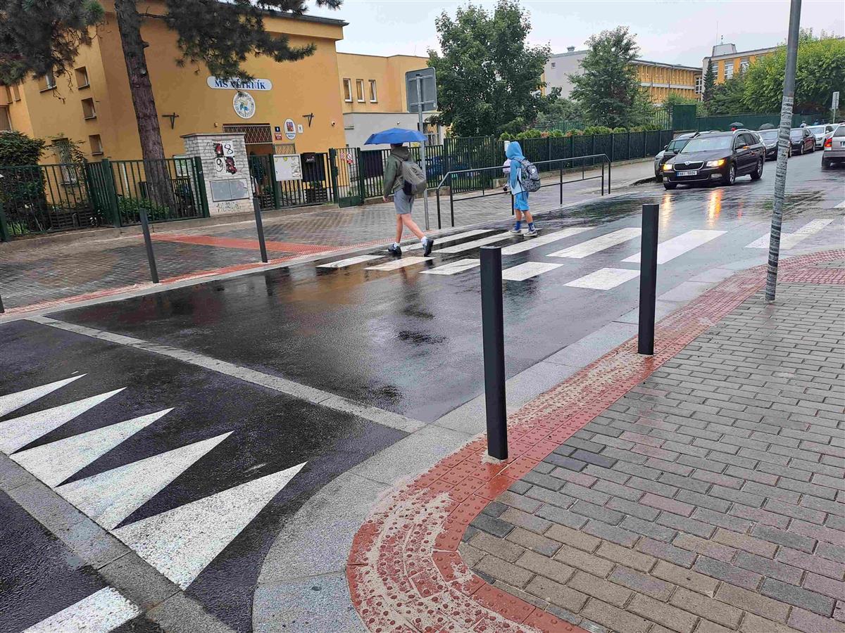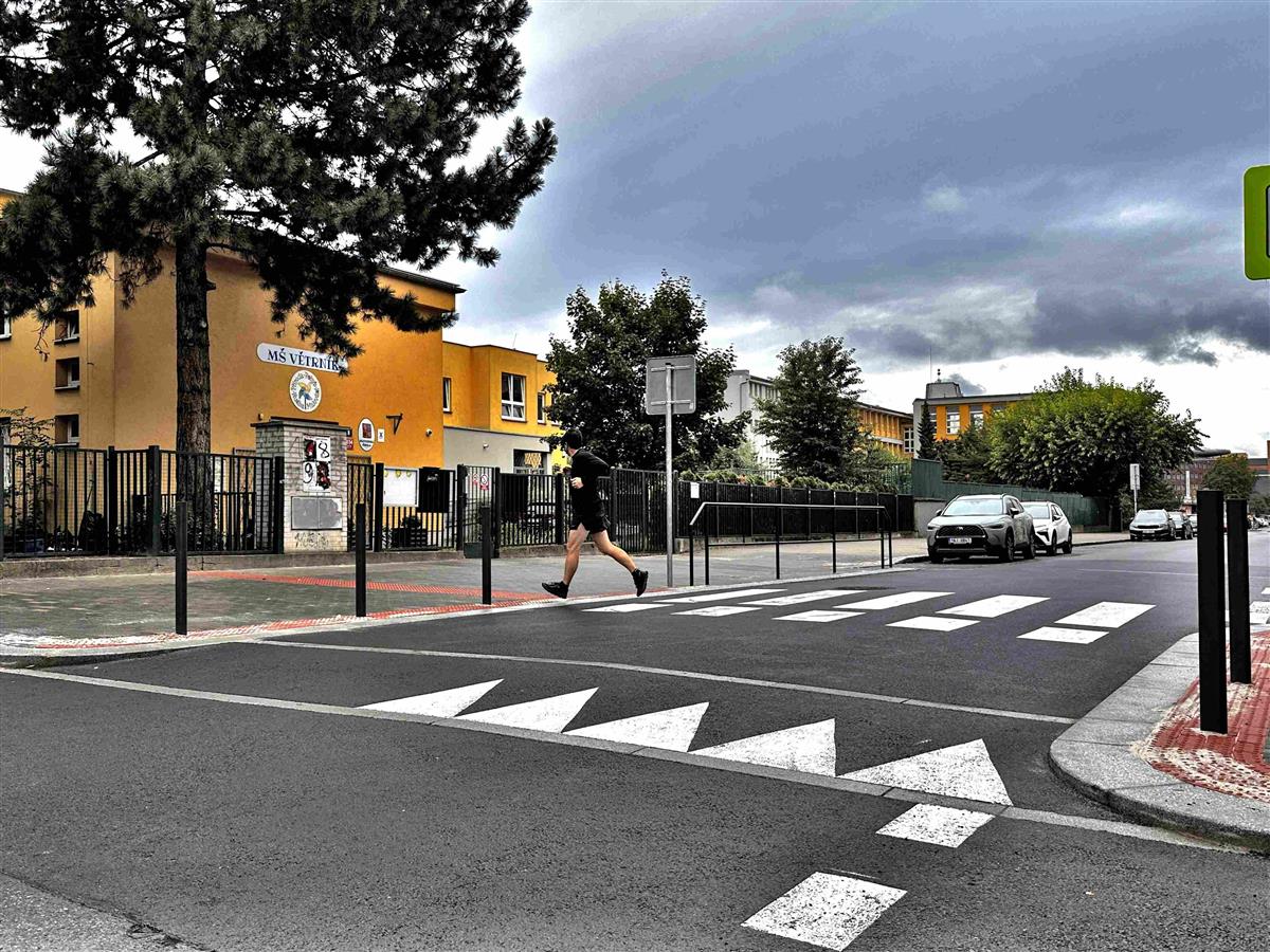 Stěžejním prvkem úpravy je zvýšení celé plochy křižovatky na úroveň okolních chodníků. Toto řešení vytváří jednolitý, bezbariérový povrch, který usnadňuje pohyb chodcům, rodičům s kočárky i osobám se sníženou pohyblivostí. Zvýšená plocha zároveň funguje jako široký zpomalovací práh, který přirozeně nutí řidiče snížit rychlost při průjezdu křižovatkou a výrazně tak omezuje riziko nehod.