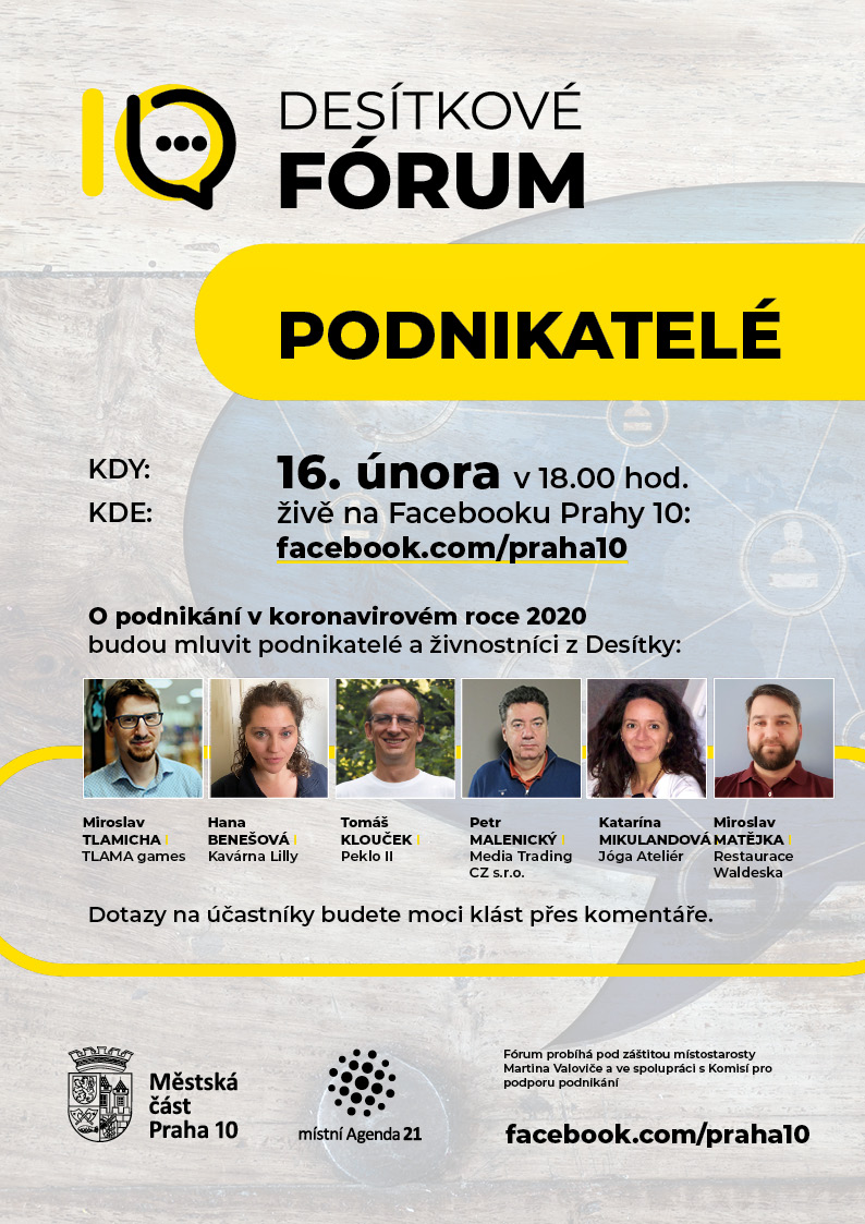 Šest panelistů z řad podnikatelů a živnostníků bude hovořit o tom, co jim aktuální koronavirová krize dala a vzala. Diskuzí na toto téma startuje MČ Praha 10 svá Desítková fóra. Účastníci a zástupci radnice se propojí prostřednictvím videokonference, živý přenos bude městská část vysílat na svém Facebooku v úterý 16. února od 18 hodin. Na debatu Desítka naváže pravidelnými snídaněmi s podnikateli a dalšími aktivitami.