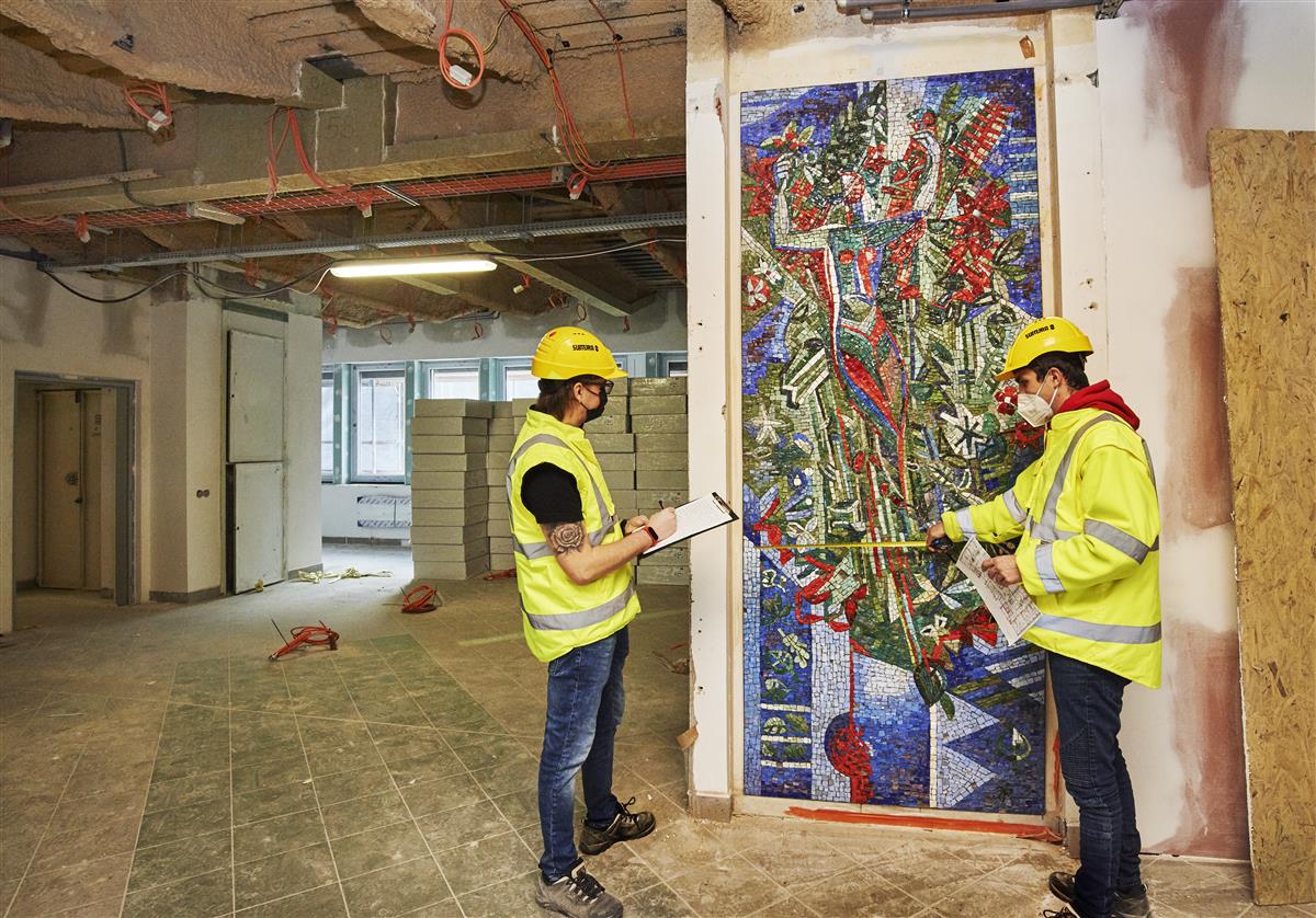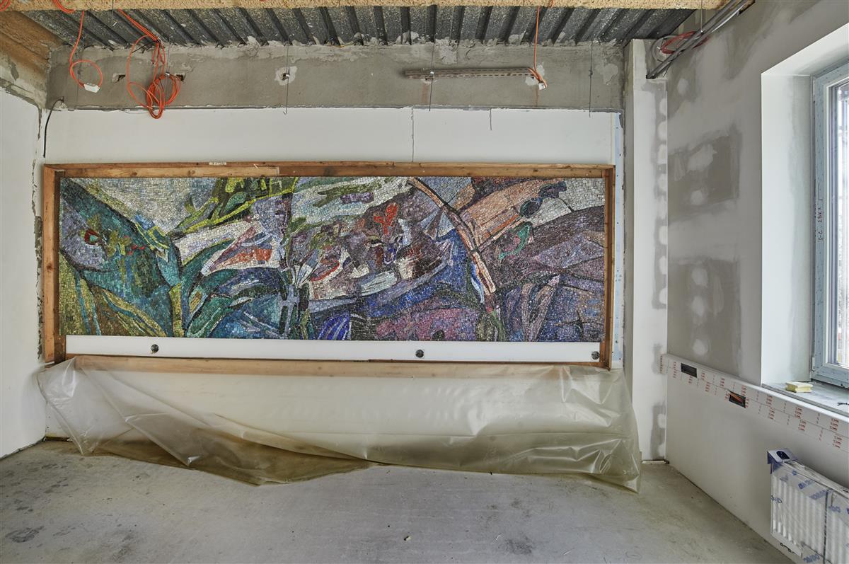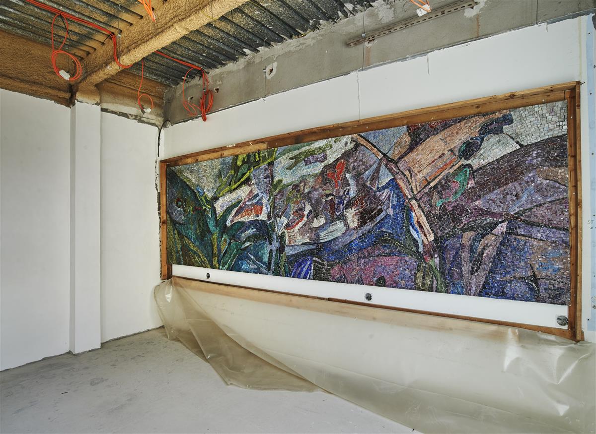 Na mozaiku narazila dodavatelská společnost Subterra při bouracích pracích v druhé etapě rekonstrukce. „Byla ukrytá za sádrokartonovou předstěnou, v prostorách někdejší jídelny v prvním nadzemním podlaží. Vedení polikliniky ji v 90. letech nechalo zakrýt, protože údržba plochy byla vzhledem k hygienickým nárokům na čistotu povrchů ve zdravotnických zařízeních příliš složitá,“ popisuje Josef Herda, vedoucí projektu ze společnosti Subterra.