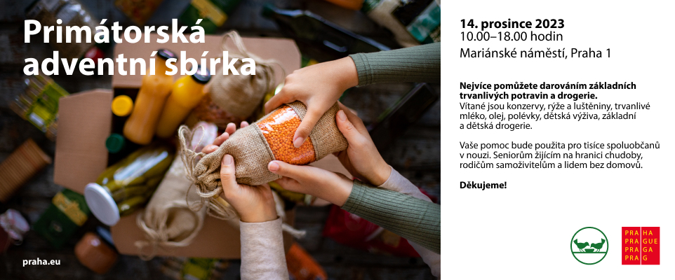 Hlavní město připravuje ve spolupráci s Potravinovou bankou pro Prahu a Středočeský kraj Primátorskou adventní sbírku. Ta proběhne 14. prosince 2023 od 10:00 do 18:00 hodin. Darováním základních trvanlivých potravin (vítané jsou konzervy, rýže, luštěniny, olej, polévky, dětská výživa, základní a dětská drogerie) bude možné pomoci spoluobčanům v nouzi, seniorům žijícím na pokraji chudoby, rodičům samoživitelům či lidem bez domova.