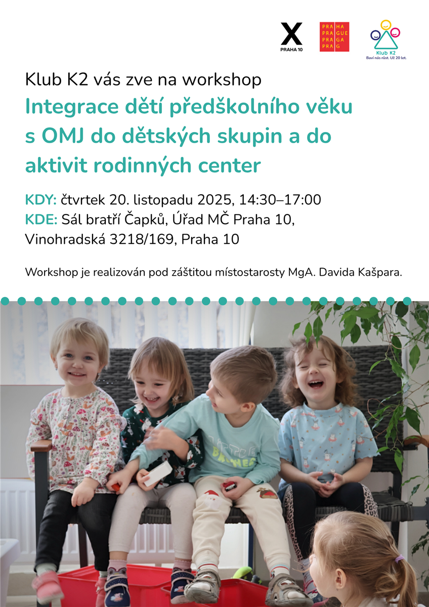 Klub K2 srdečně zve pracovníky dětských skupin a rodinných center na seminář zaměřený na integraci dětí s odlišným mateřským jazykem. Na semináři se pracovníci dětských skupin dozví, jak dětem usnadnit vstup do kolektivu a podpořit jejich zapojení do aktivit. Seminář se bude konat dne 20. 11. 2025 od 14.30 v zasedacím sále bratří Čapků na ÚMČ Praha 10.