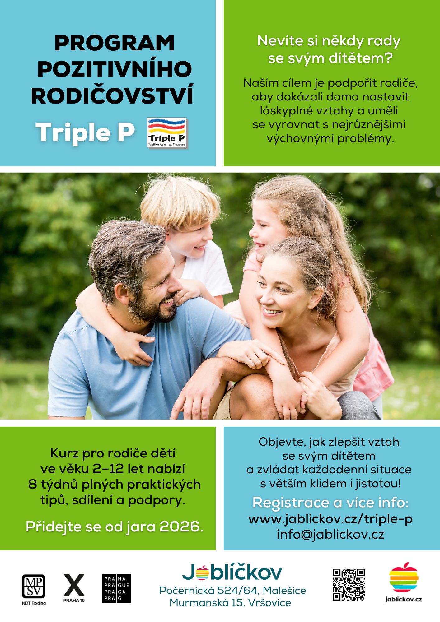Přihlášky a podrobné informace jsou dostupné na www.jablickov.cz/triple-p nebo e-mailem na info@jablickov.cz.