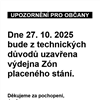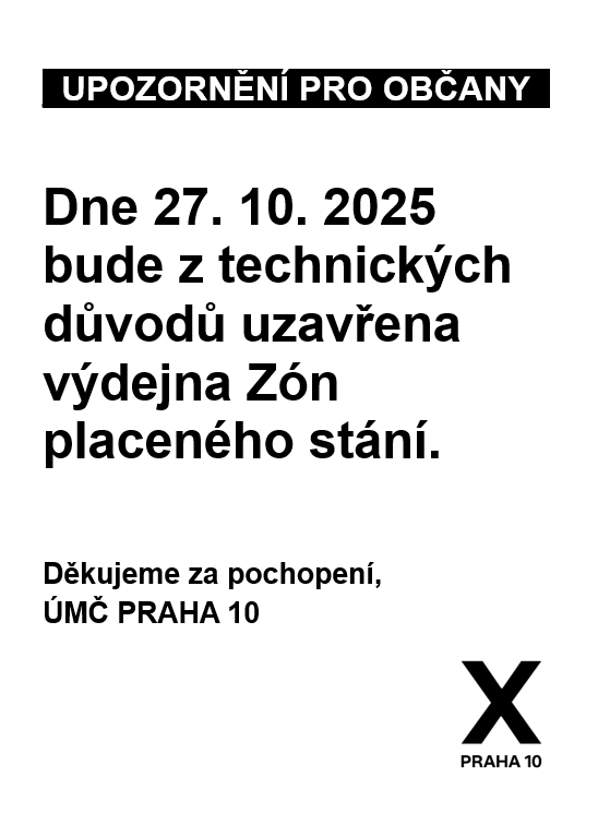 Úřad městské části Praha 10 si dovoluje informovat občany, že v pondělí 27. října 2025 bude z technických důvodů uzavřena výdejna Zón placeného stání (ZPS).
