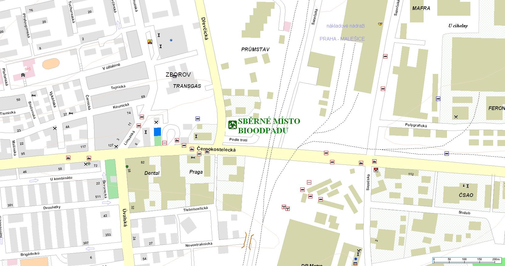 Sběrné místo bioodpadu se nachází v Praze 10, Malešicích - ulice Dřevčická (cca 100m od ulice Černokostelecká) - mapa. Otevřeno je: Po - Pá 7,00 až 18,00 hod. (v době zimního času do 17,00 hod.) a So 7,00 až 15,00 hod., tel. 274 772 694. Sběrné místo je uzavřeno přibližně od poloviny prosince do března následujícího roku. V tomto období je možné bioodpady odevzdávat ve sběrných dvorech.