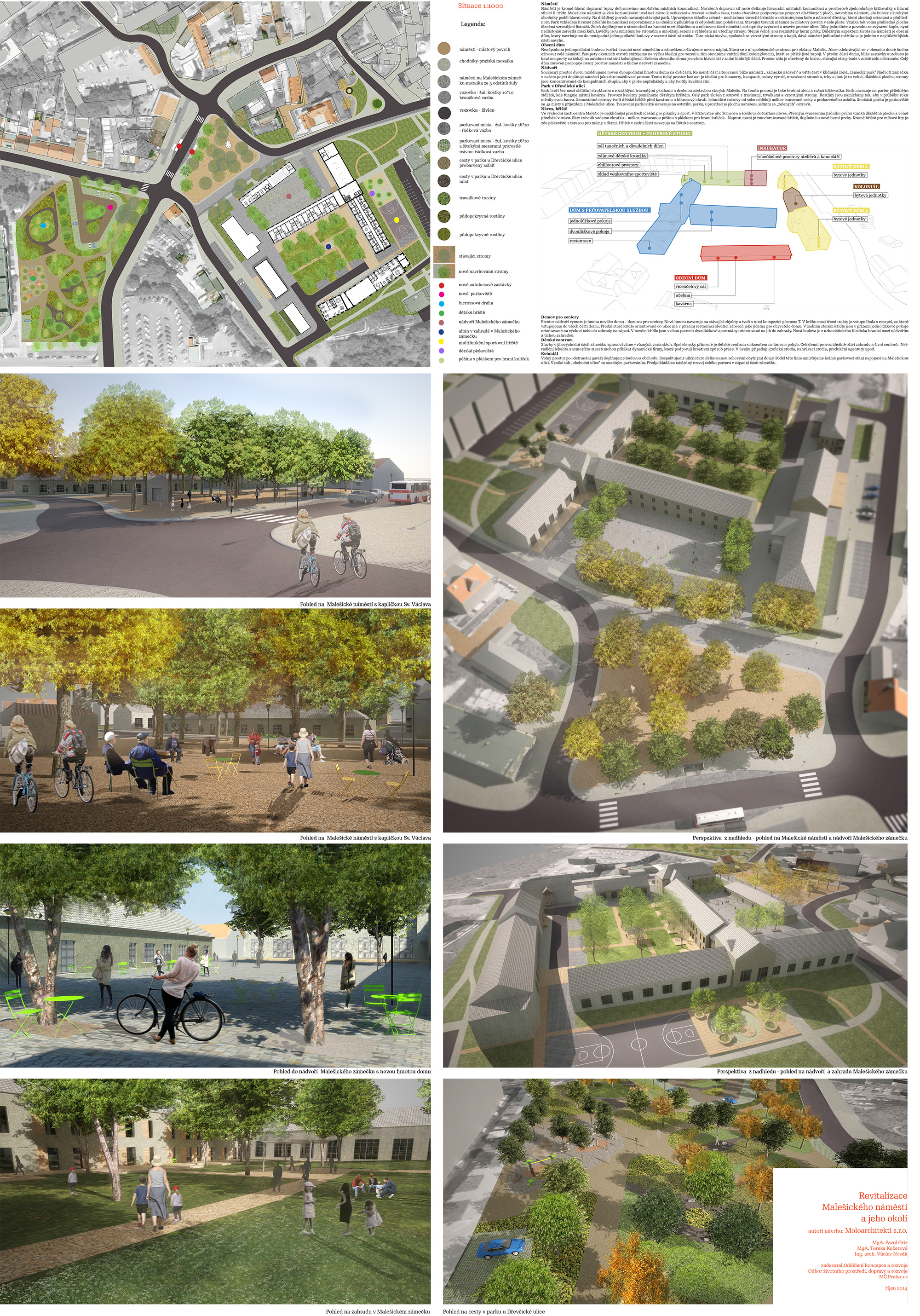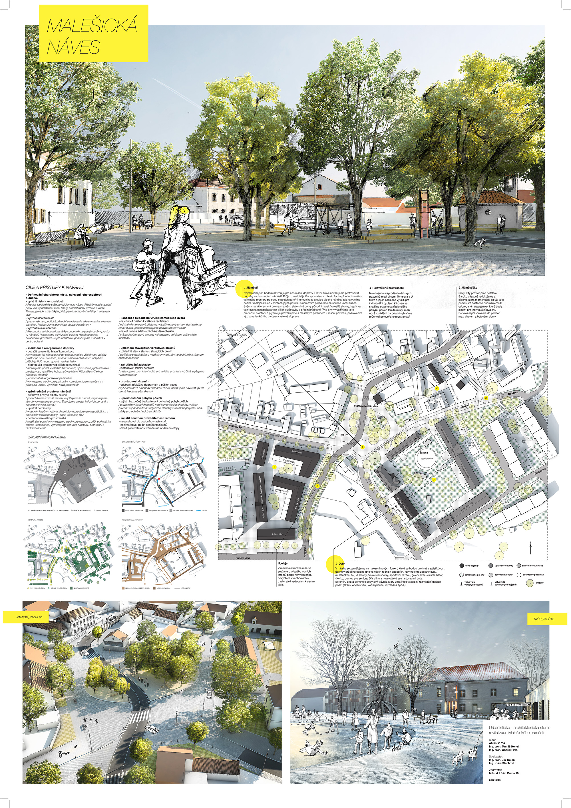 Městská část Praha 10 nechala v roce 2014 vypra­covat tři ideové návrhy řešení Malešického náměstí a jeho okolí. Vstupním podkladem pro jejich návrhy bylo zadání, předem konzultované s odborníky z Institutu plánování a rozvoje hl. m. Prahy (dále IPR), s promítnutými podněty občanů získanými během participačních jednání z dubna roku 2014.