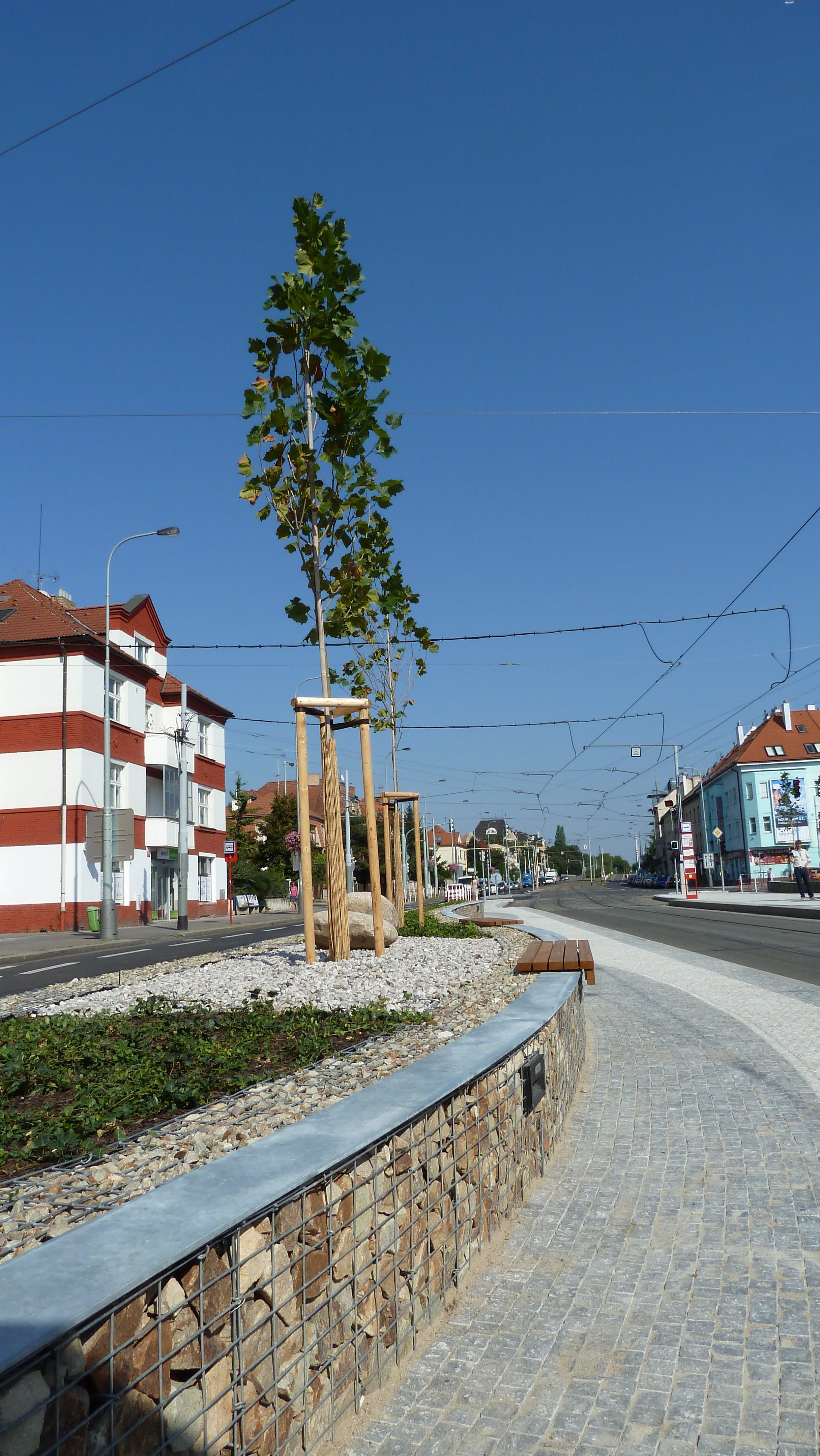 Odclonění ostrůvků zvýšeným pásem zeleně nabízí prostor pro zpříjemnění čekání na tramvaj i využití ke každodenním krátkodobým setkáním. Plochy zeleně vymezené nízkými zídkami z gabionových košů jsou osázeny půdopokryvnými, převážně stálezelenými keři, dekorativní trávou a doplněny skupinami lomového kamene. Řada rovnoměrně vysázených stromů po celé délce zastávky ve formě „stromořadí“ dodá prostoru lidské měřítko i potřebný stín.