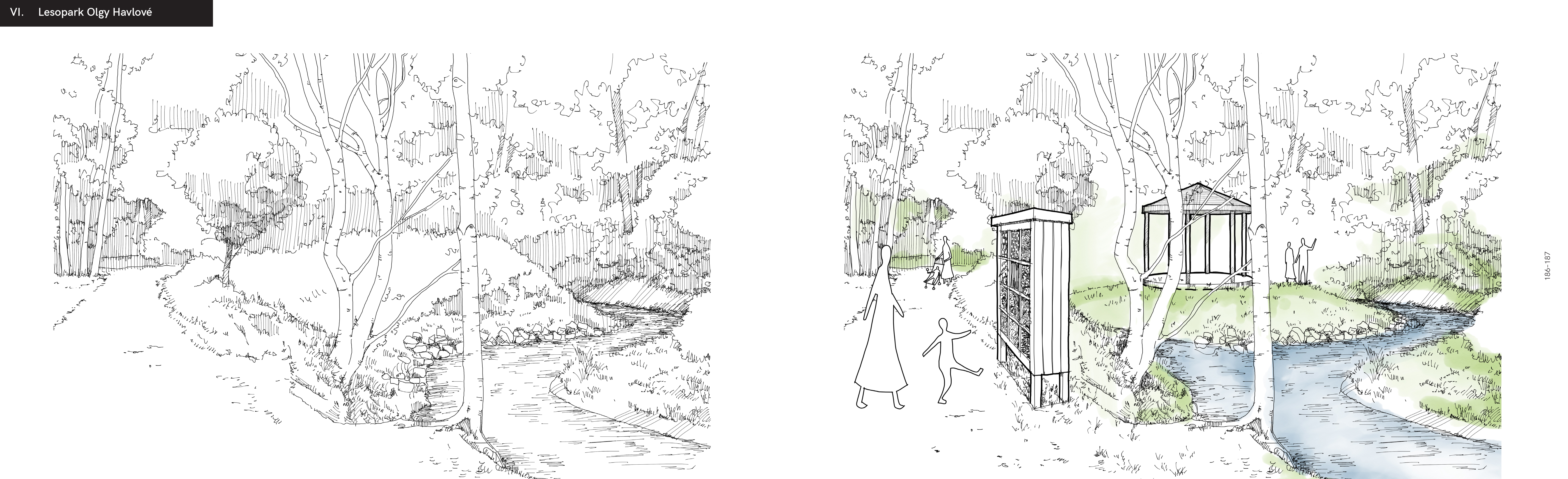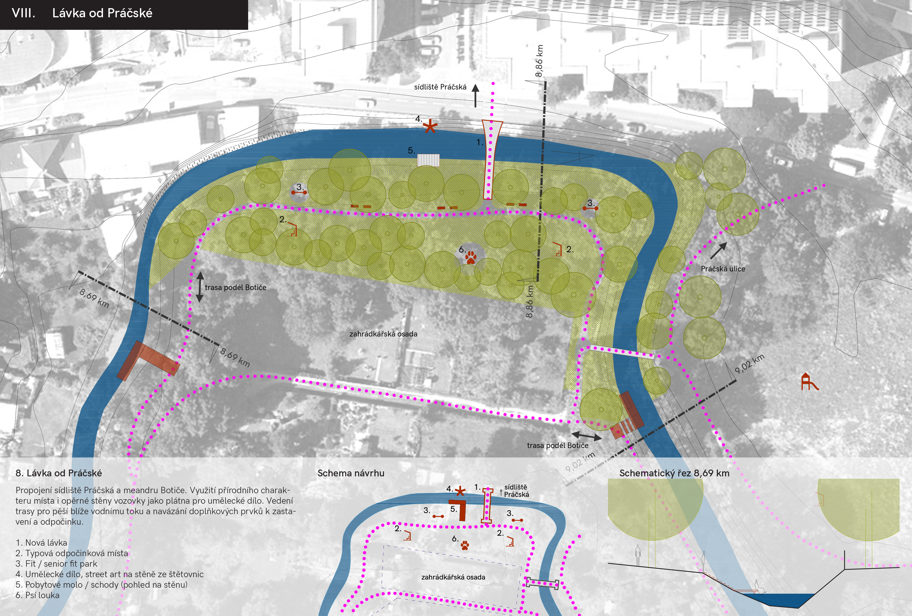 Botič – výřez návrhové části, skici - stávající stav a návrh
