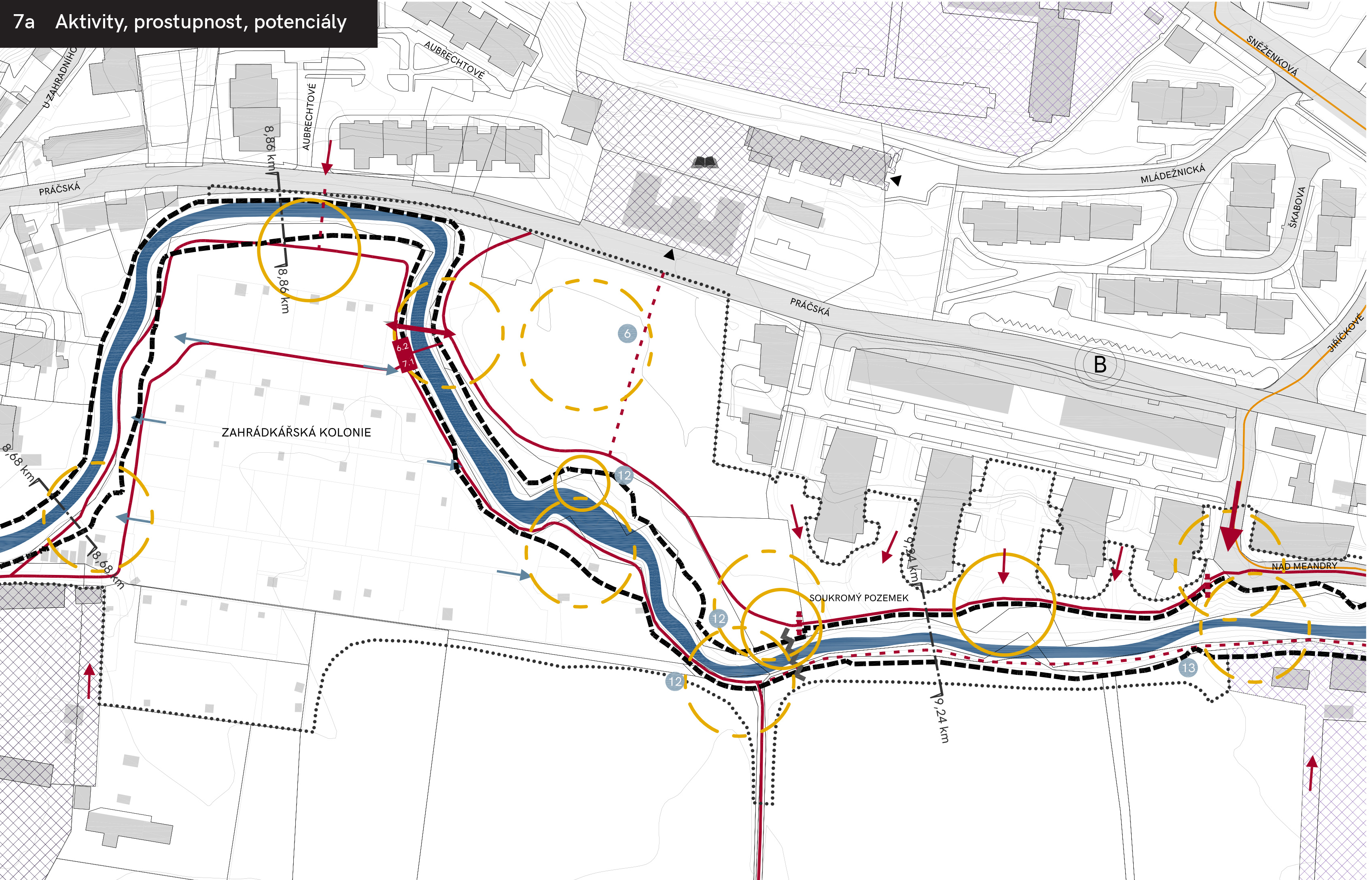 Botič – výřez analytické části: aktivity, prostupnost a potenciály toku Botič